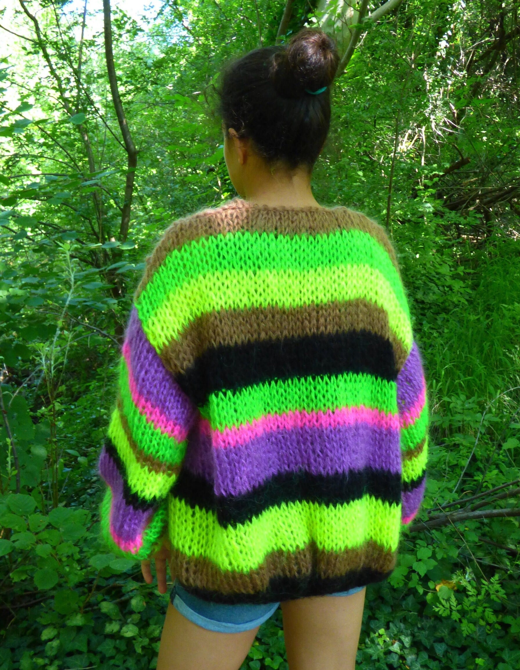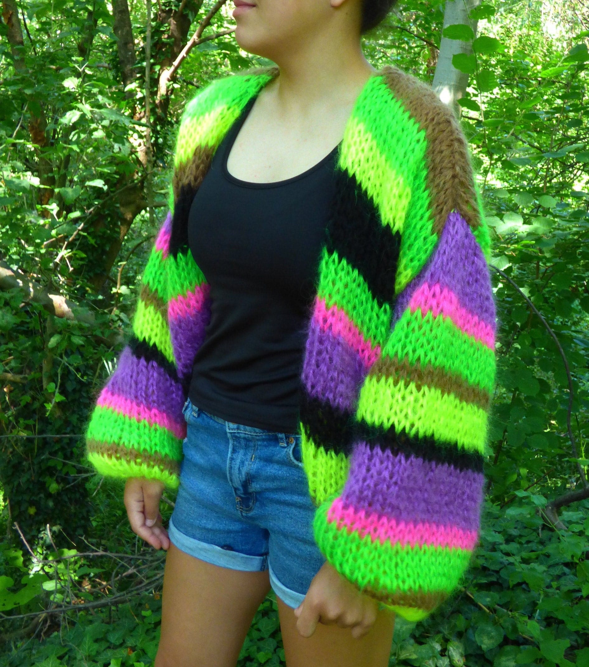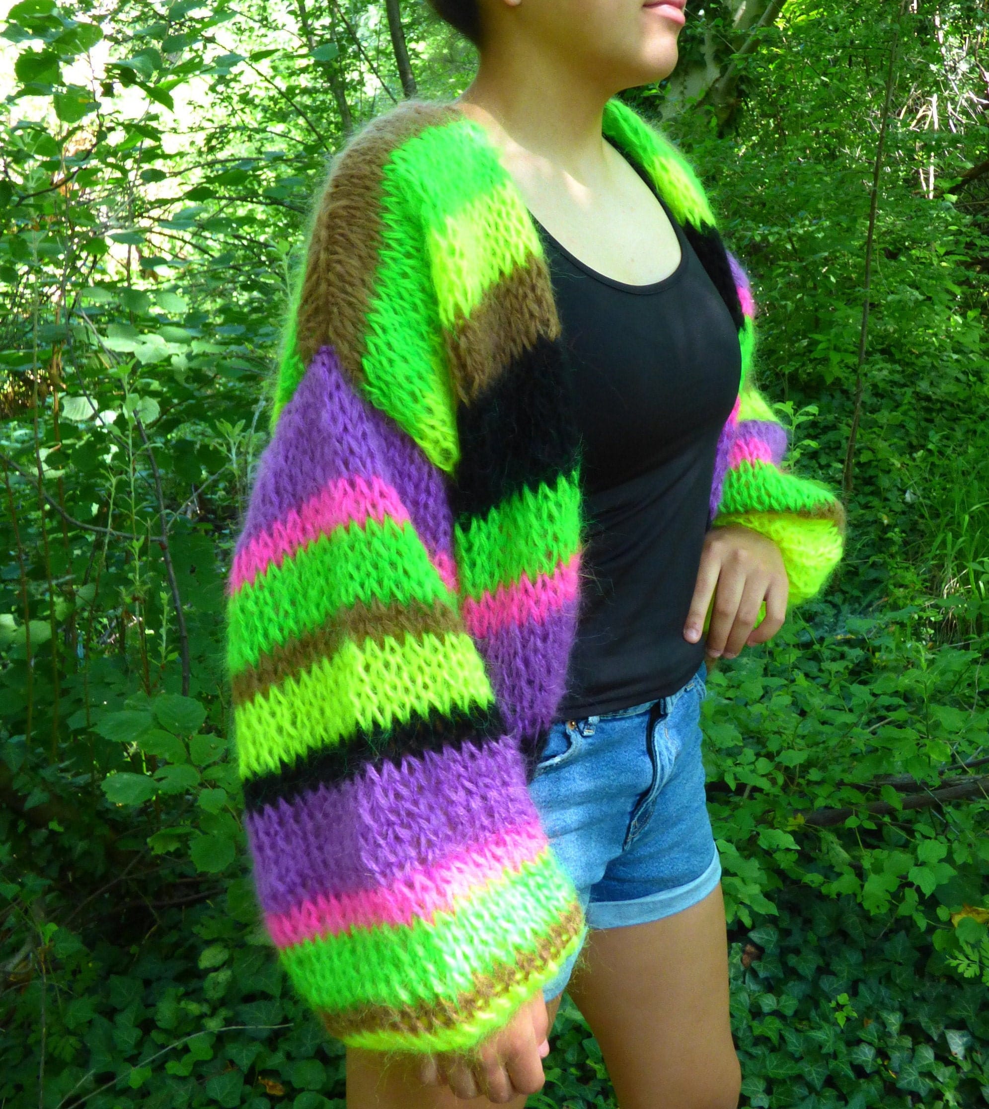 Add color and comfort to your wardrobe with knitted multi-colored mohair cardigan Neon Light – handmade, which emphasizes individuality and a sense of comfort.