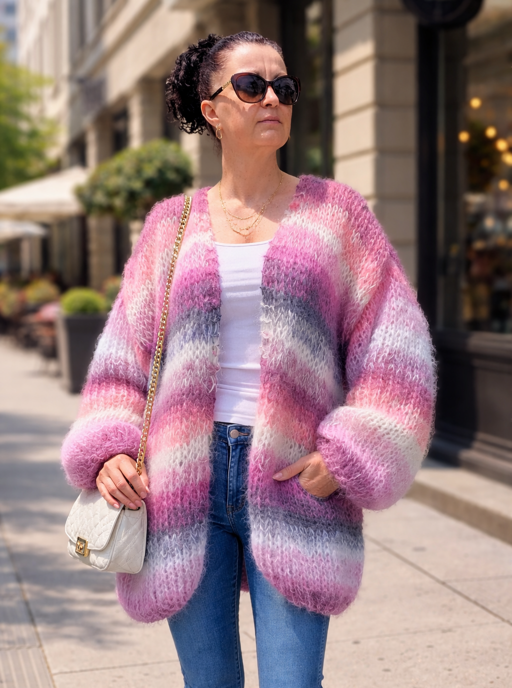 Knitted in a combination of several colors, gently and elegantly iridescent.