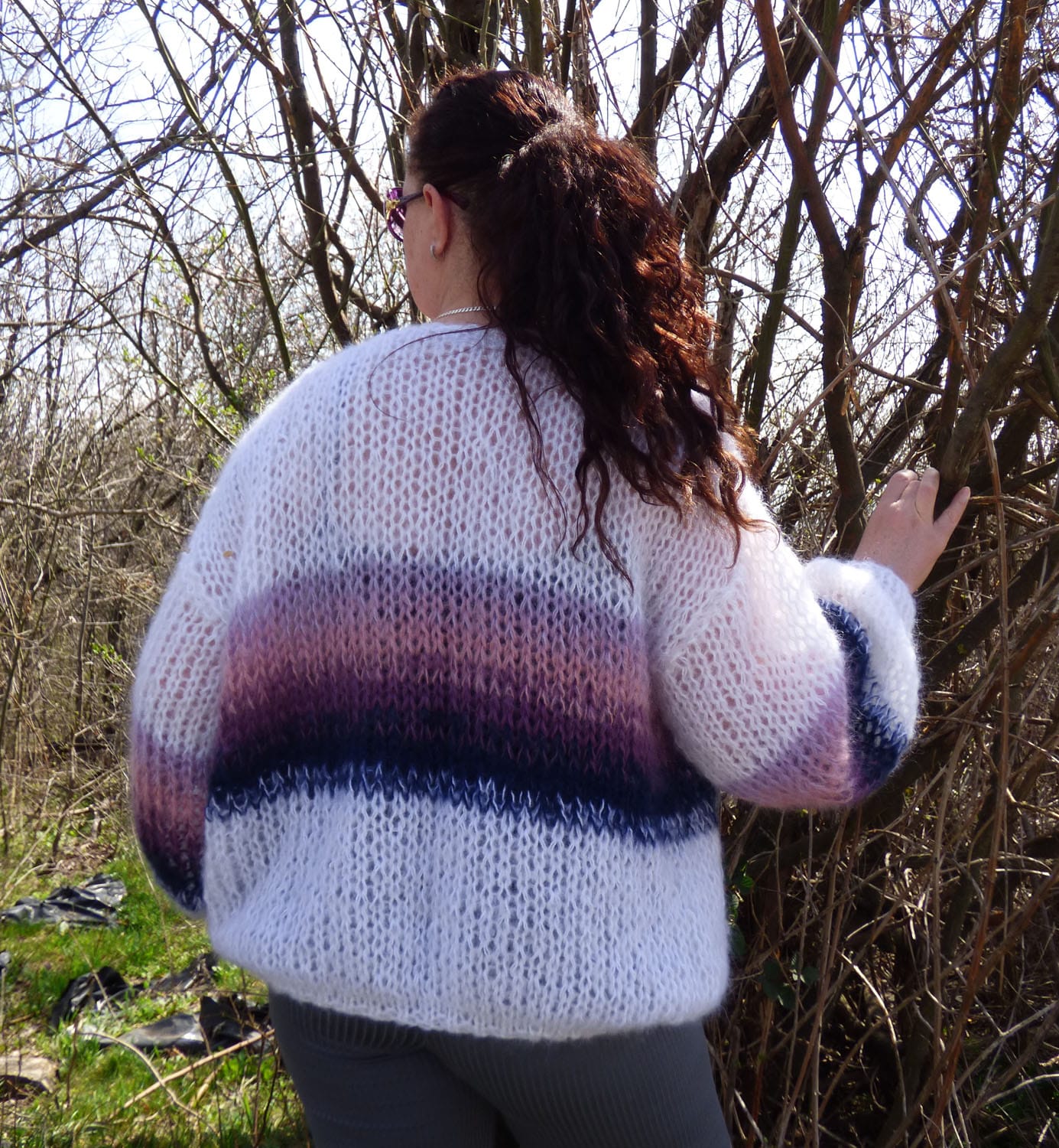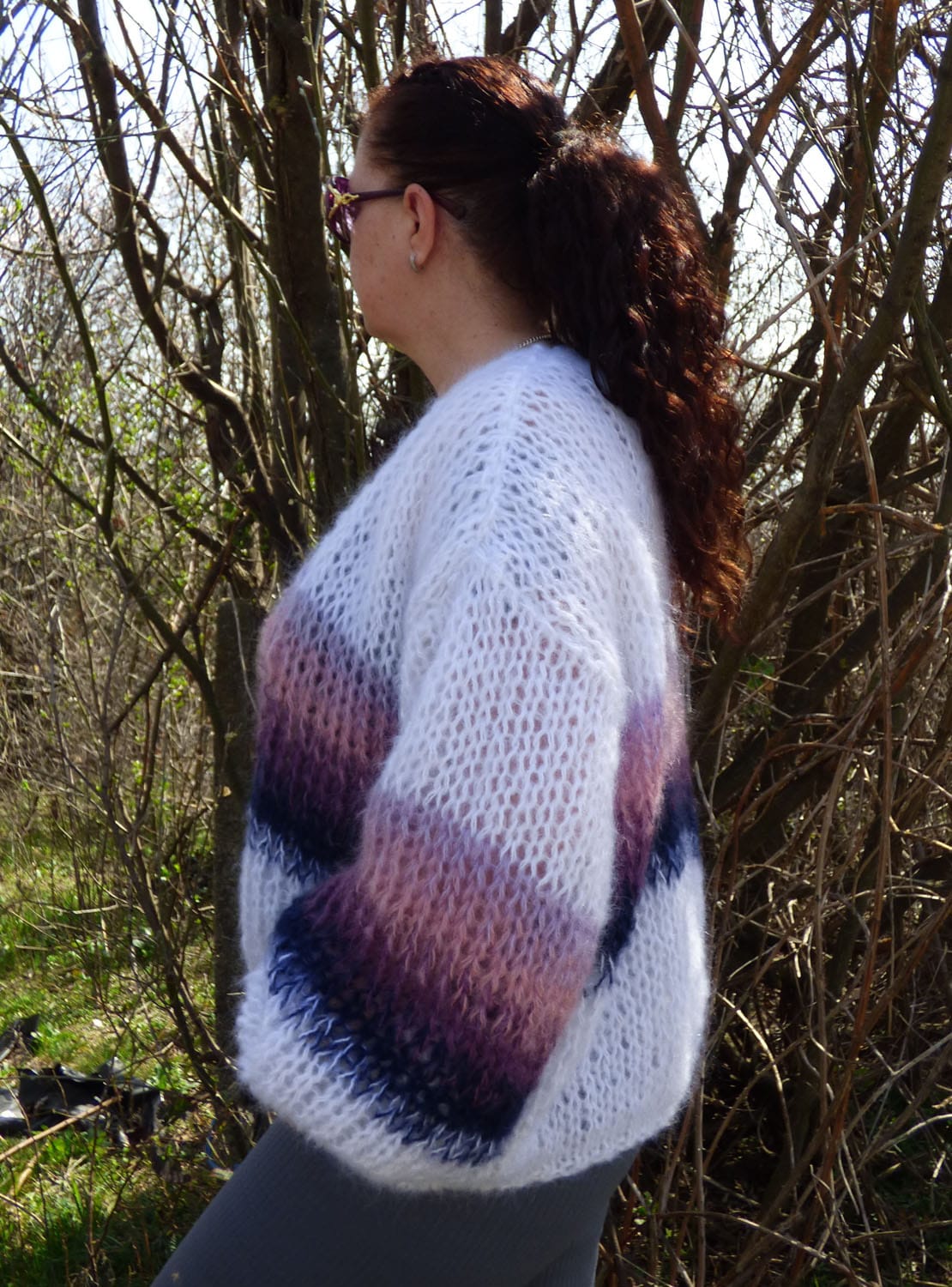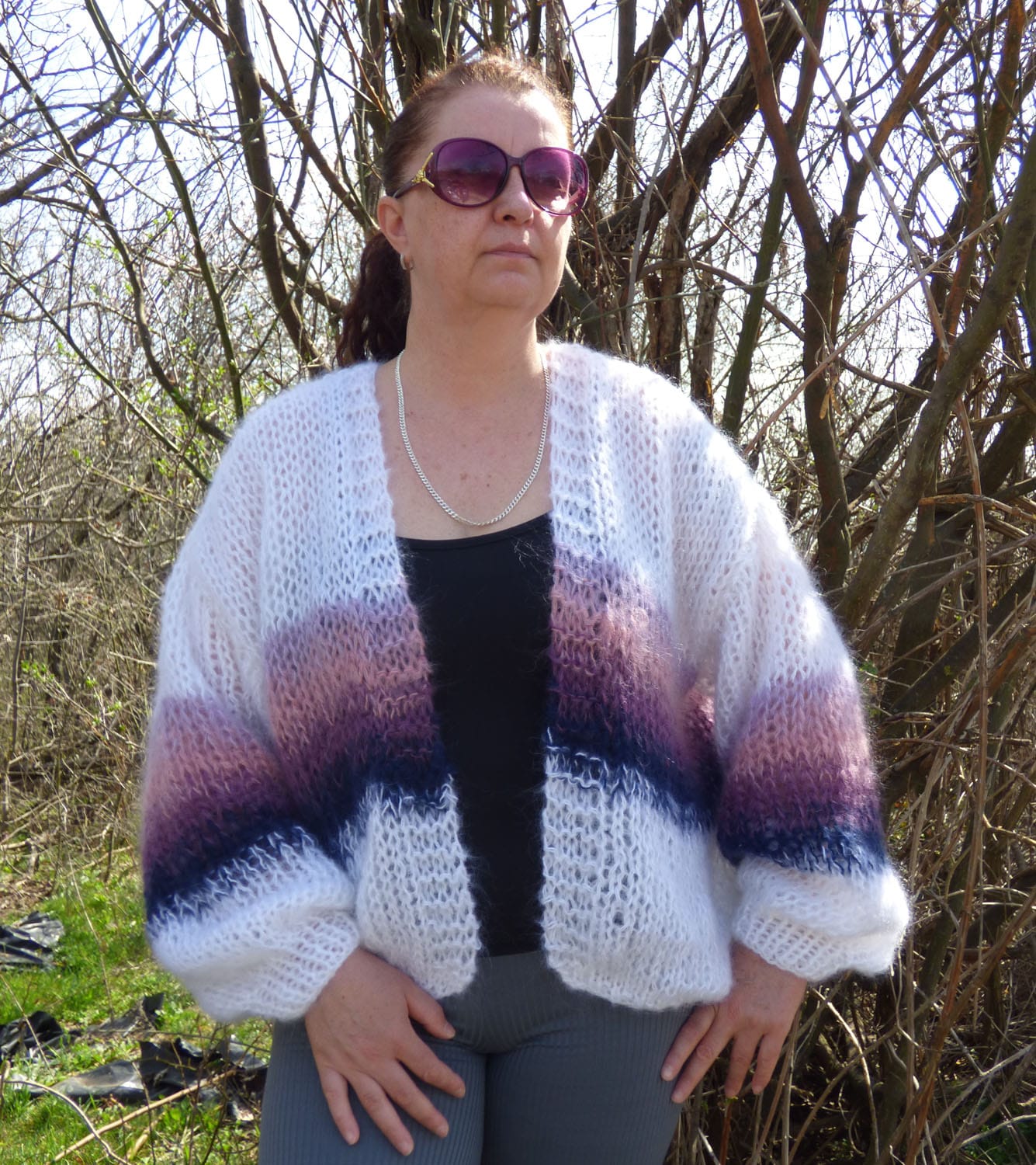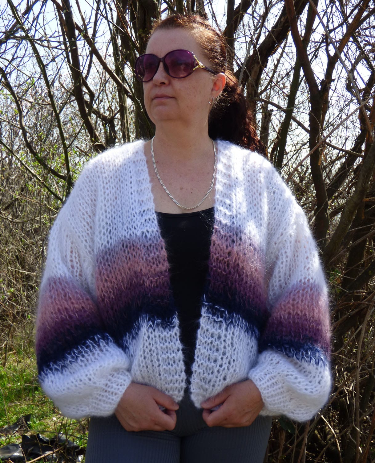 Knitted cardigan in white mohair Snow is an exquisite model that combines tenderness and style. Hand-knitted from high-quality mohair yarn with added acrylic, it is extremely soft, warm and comfortable to wear. The base is knitted in classic white, with the sleeves in a fresh combination of several colors, giving the cardigan a unique character. The model has a straight neckline and spectacular balloon sleeves, which provide a modern look and freedom of movement.