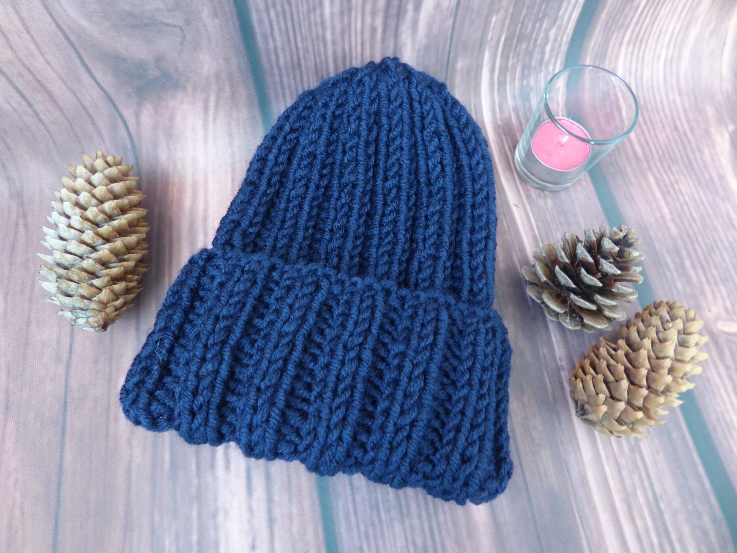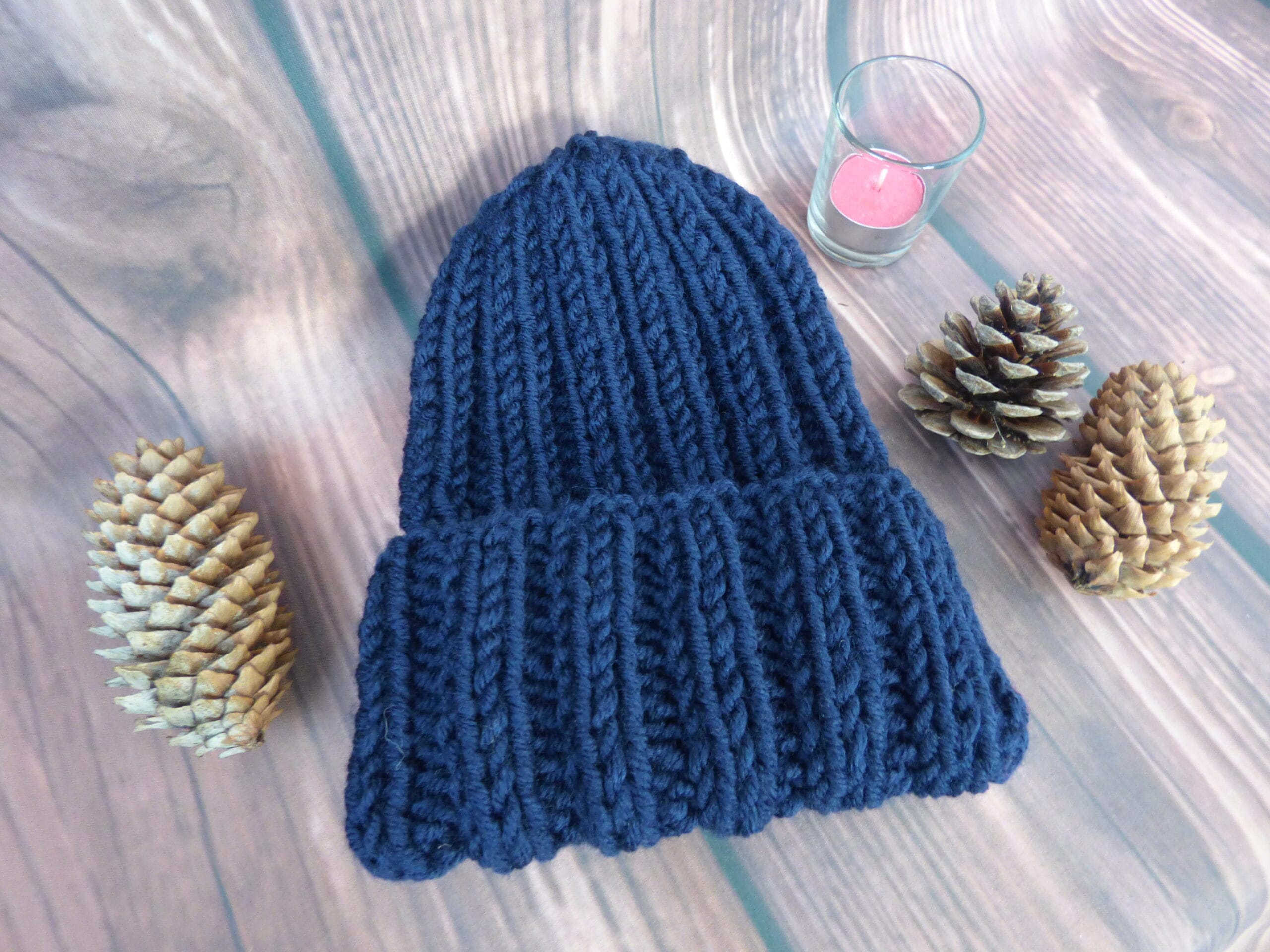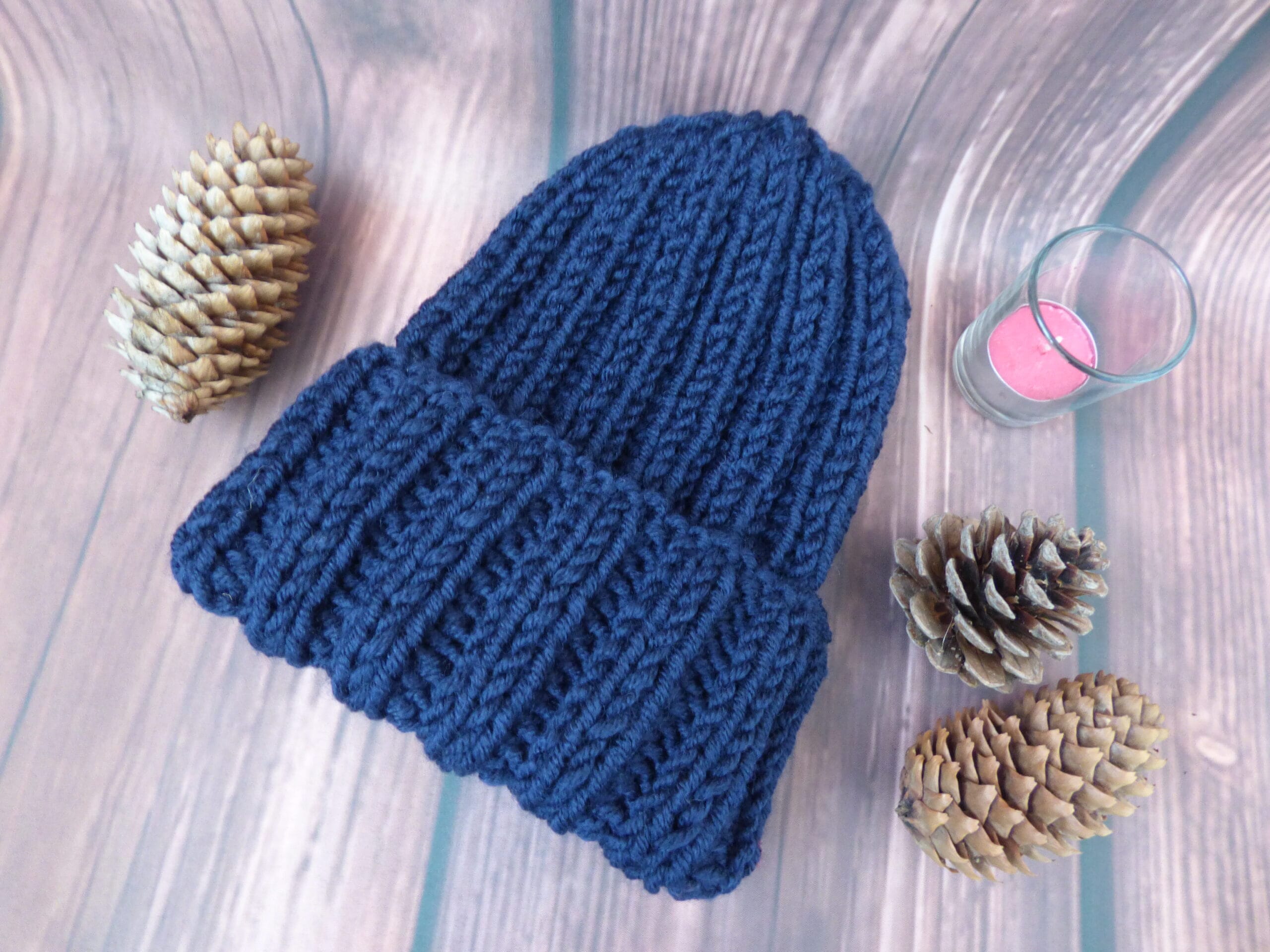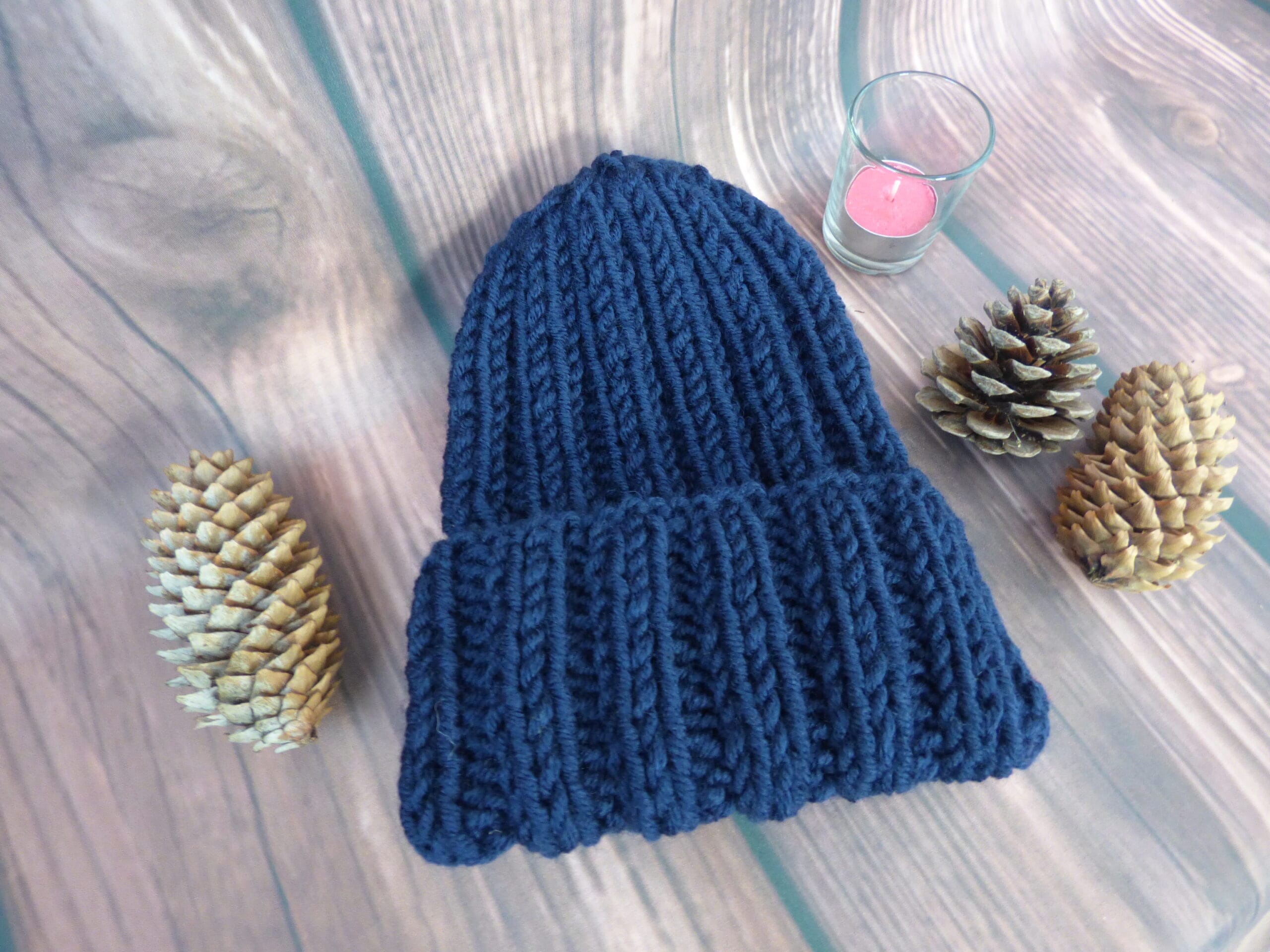 Ръчно плетена мъжка вълнена шапка тъмно синя